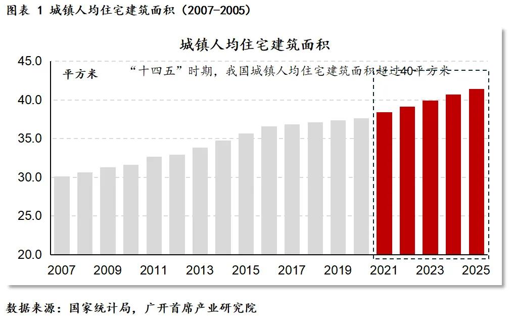 从全球来看,我国居民目前住宅水平已达中等偏高水平。2023年底,我国城镇人均住房建筑面积已超过40平方米。参考2021~2023年均值变化测算,预计到2025年底,我国城镇人均住房建筑面积可能达到41.4平方米(见图1),较“十三五”时期累计增长约3.8平方米,表明我国城镇人均住房建筑面积将持续上升。城镇户均套户数从2004年的0.84套,至2020年的1.02套,到2025年套户数接近1.10套。目前美日约为1.15~1.20,英德为1.0~1.05水平。